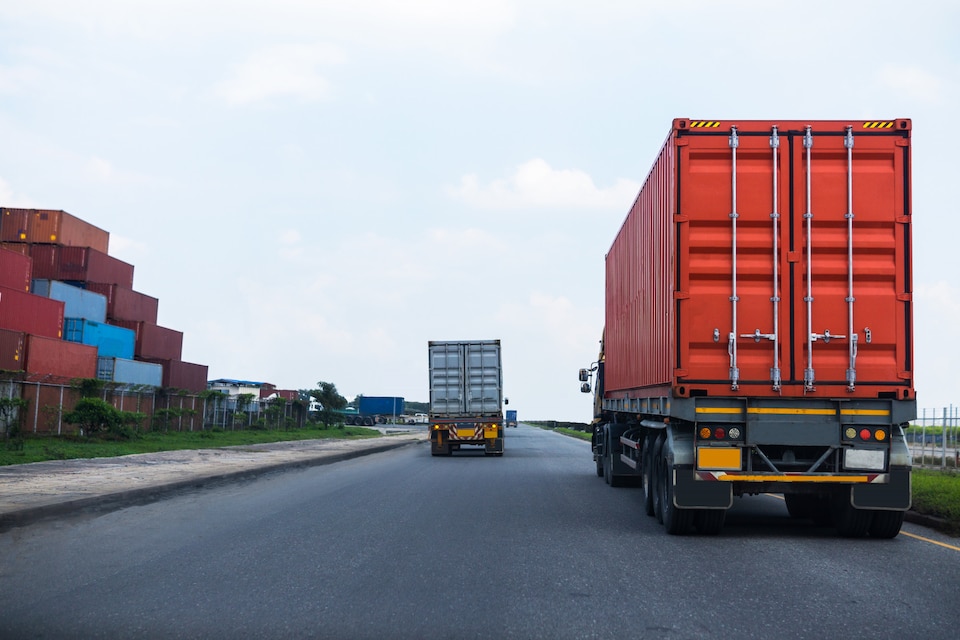 コンテナに積載した中古車をトレーラーで港まで安全にお運びします。
